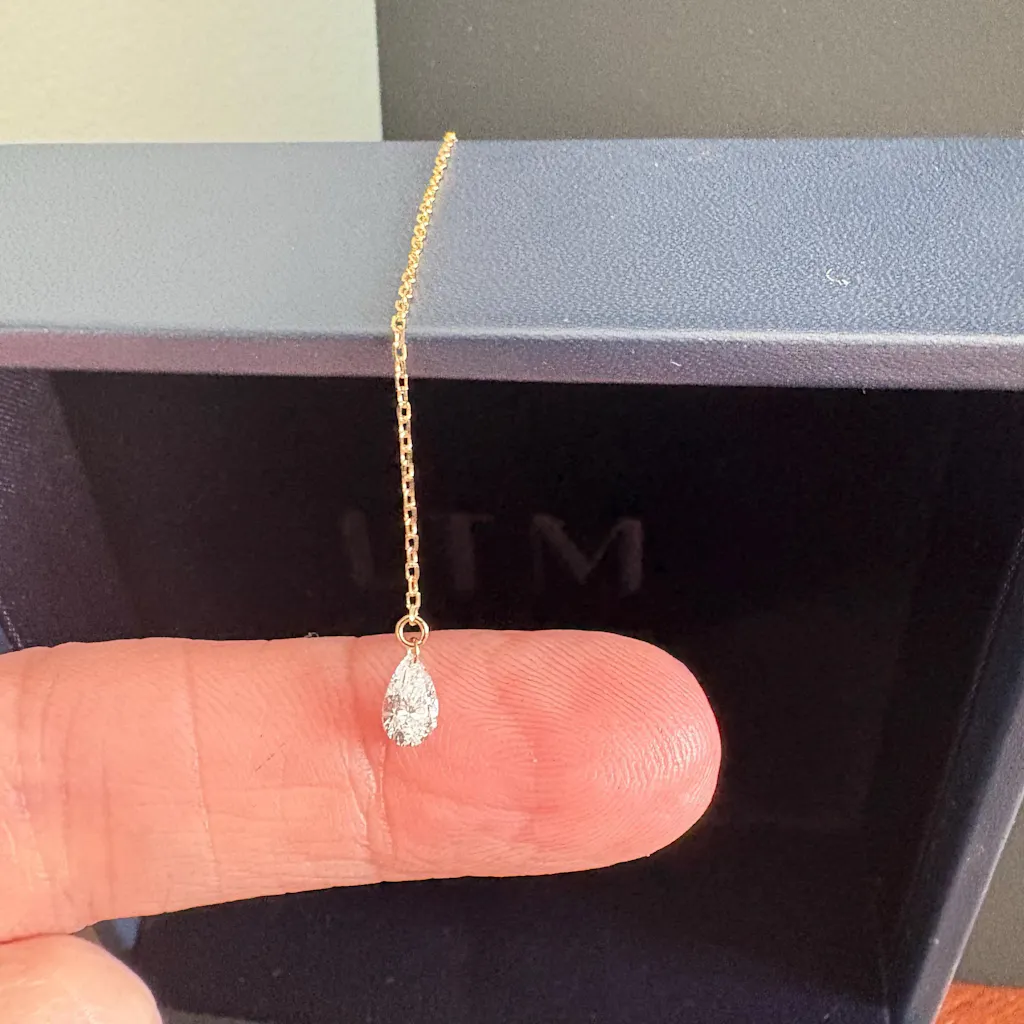 Minimalist elegance in fluid motion. The Pear Diamond Threader redefines the classic line earring, featuring a striking, hand-selected pear-cut diamond suspended from a whisper-thin 18K gold chain. Designed by LTM Jewels to be a "weightless" statement, this piece glides with your every gesture, capturing and reflecting light with a subtle yet captivating brilliance. Whether worn long for a dramatic vertical sweep or looped through multiple piercings for a rhythmic, draped effect, it brings a contemporary, celestial edge to your curated ear stack.