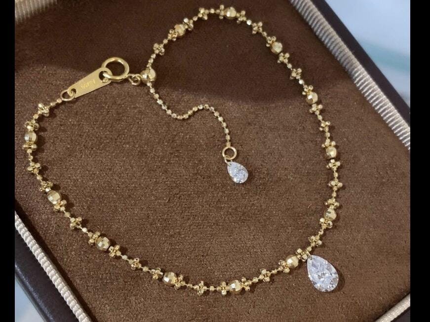 The Craftsmanship Expertly handcrafted in 18K solid gold, this bracelet features a 0.15ct pear-shaped diamond in our signature floating diamond laser-drilled setting. The 18cm shimmering bead chain is equipped with a sliding silicone bead, allowing you to adjust the length with precision. This piece is nickel-free, hypoallergenic, and built for 24/7 comfortable wear. VVS-VS clarity, D-E color.