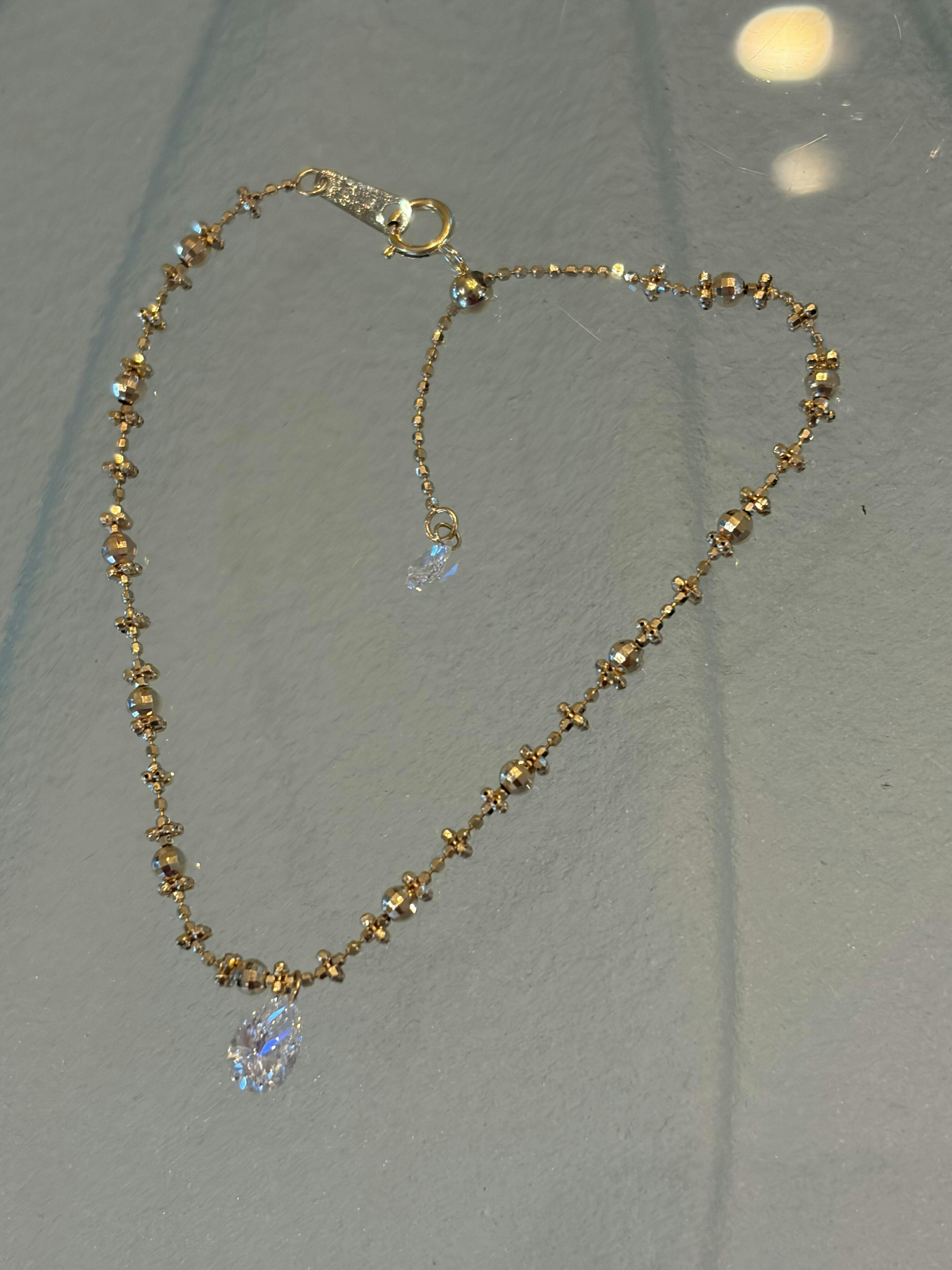 The Aesthetic A study in minimalist elegance and effortless motion. The Solitary Dew redefines the classic gold bracelet with a single, striking Lab Grown Pear-Cut Diamond. Suspended along a shimmering diamond-cut bead chain, this floating diamond glides with every movement, creating a subtle yet captivating sparkle. Its adjustable design ensures a perfect fit, making it a versatile staple for any curated wrist stack.