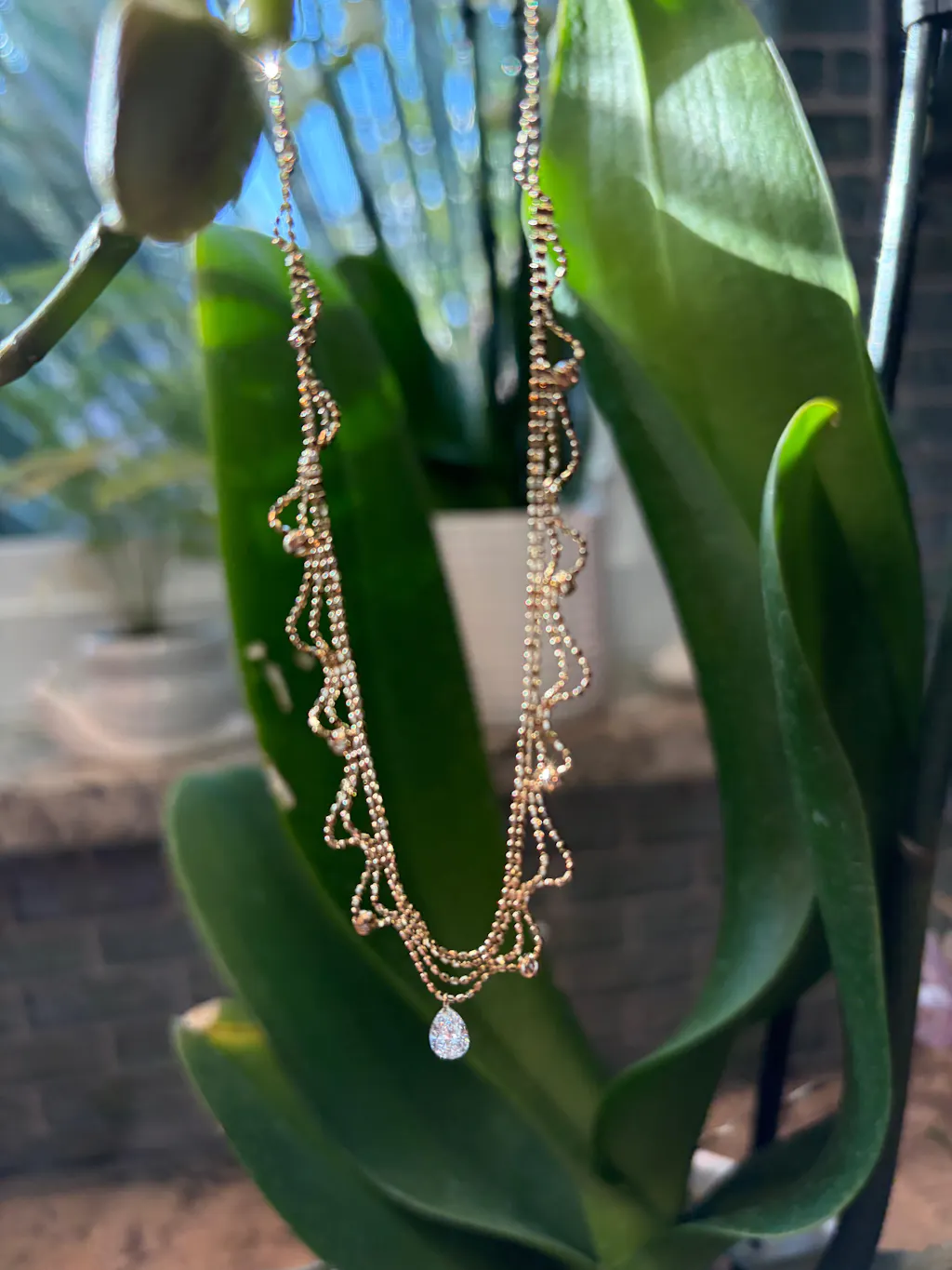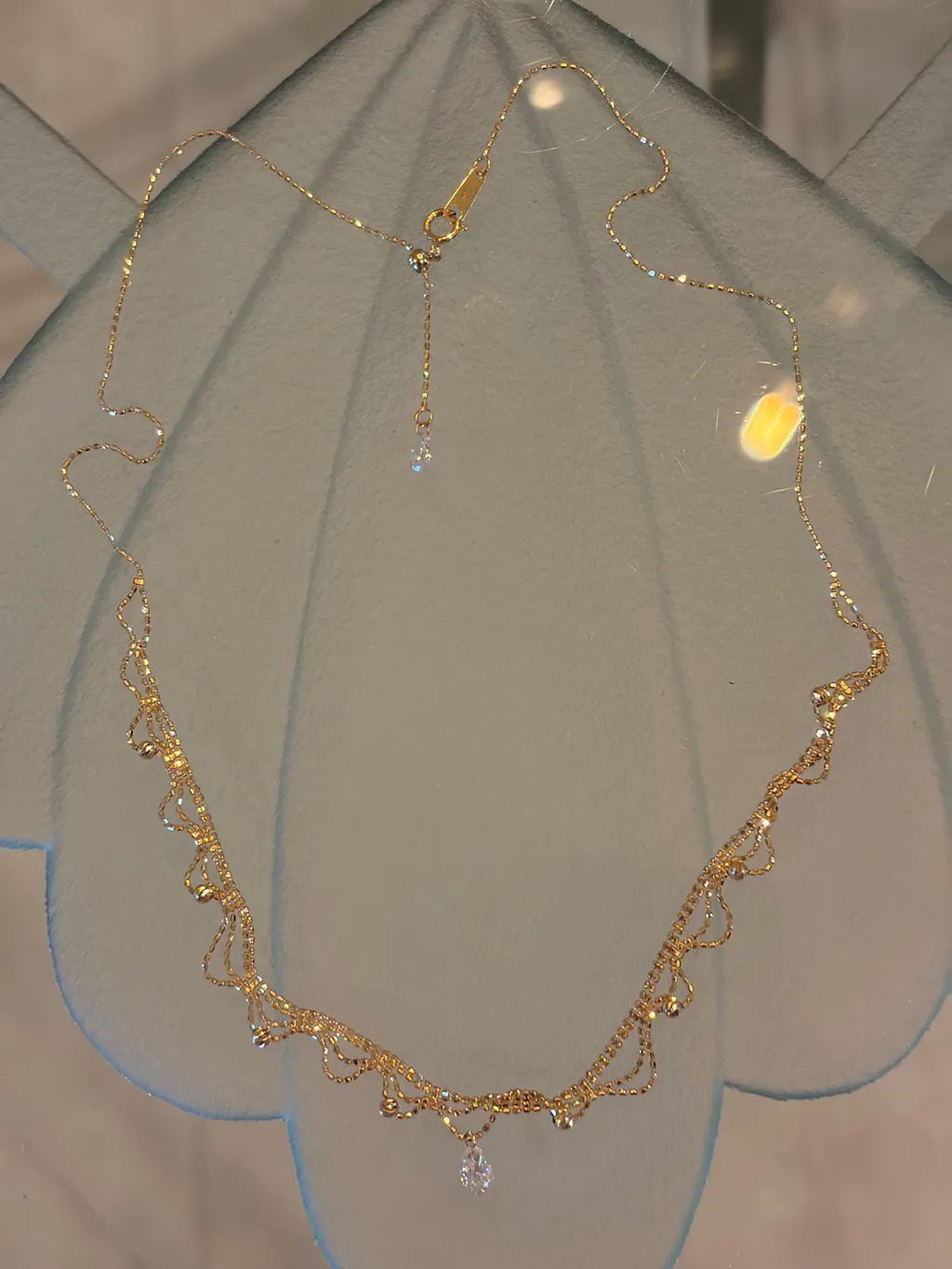 The Aesthetic A romantic study in fluid brilliance. This 18K solid gold necklace features delicate scalloped lace draping that evokes the softness of vintage silk. A 0.4ct floating pear diamond hangs from the central arc, dancing with weightless grace along the collarbone.