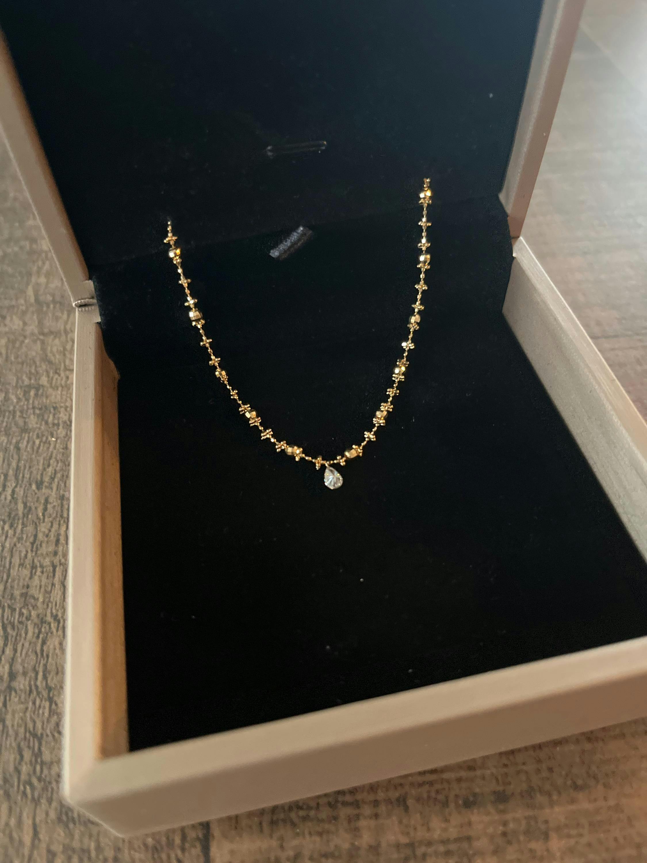 La Estética. Un estudio de elegancia minimalista y movimiento fluido. El Solitary Dew redefine la clásica pulsera de oro con un único y llamativo diamante de talla pera cultivado en laboratorio . Suspendido a lo largo de una brillante cadena de cuentas con corte de diamante, este diamante flotante se desliza con cada movimiento, creando un brillo sutil pero cautivador. Su diseño ajustable garantiza un ajuste perfecto, convirtiéndolo en un básico versátil para cualquier muñeca.