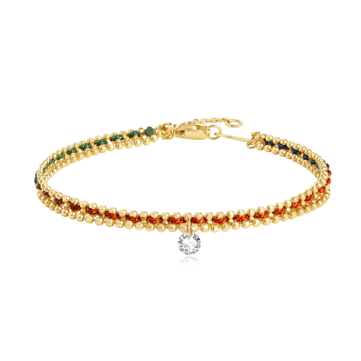 Our classic floating diamond and fantasy woven rope bracelet with a touch of motion. This solid gold bracelet hangs a drill white diamond along the shining beads chain. Bracelet approximately length: 16cm+2cm extension chain